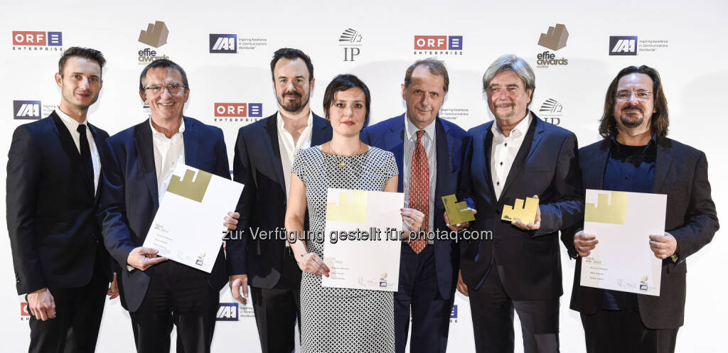 Michael Wallner (Brau Union Österreich), Andreas Stieber (Brau Union Österreich), Michael Donhofer (Starcom), Johanna Knaus (McCann), Markus Liebl (Brau Union Österreich), Christof Sigel, Dieter Pivrnec (McCann) : Gösser kracherlt in der Werbebranche: Für die "Früher hätt’s das nicht gegeben!" Kampagne für Österreichs erstes Bierkracherl wurde Gösser mit dem effie award in Gold, dem bedeutendsten österreichischen Werbepreis, ausgezeichnet : Fotocredit: Thomas Jantzen, © Aussendung (02.11.2015)
