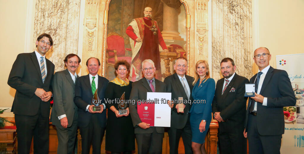 Markus Figl (Design. Bezirksvorsteher), Josef Bitzinger (WKW-Vizepräsident), Ulrich Steinleitner (Ma Maison-GF), Marina Röhrenbacher (VBS Mödling Direktorin), Peter Förtsch-Lehmann (Konditormeister), Erwin Pellet (Einkaufstraßen-Repräsentant), Eva Zirps-Ehrenberger (Spartenobmann-Stv.), Klaus Schmidtschläger (Gremialobmann), Werner Unger : Vergabe der Tischkultur Awards 2015 : Fotocredit: Pictures Born/Foto Nessler, © Aussendung (26.11.2015)