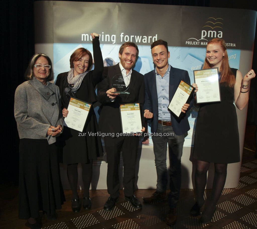 Brigitte Schaden (Projekt Management Austria/pma Vorstandsvorsitzende), Projektteam des Management Centers Innsbruck : Sieger des pma junior award 2015 mit ihrem eingereichten Projekt „Traumberuf Sozialarbeit“ : Fotocredit: pma/Mayr, © Aussendung (30.11.2015)