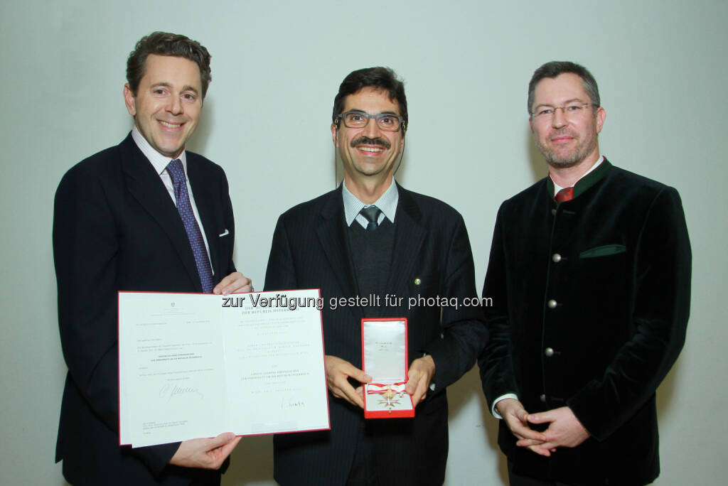 Harald Mahrer (Staatssekretär), Martin Gerzabek (Rektor der Universität für Bodenkultur), Elmar Pichl (Sektionschef) : Mahrer überreicht hohe staatliche Auszeichnungen an verdiente Persönlichkeiten der Wissenschaft : Ehrenzeichen- und Berufstitelverleihung im Wissenschaftsministerium als Zeichen der Anerkennung und des Dankes :