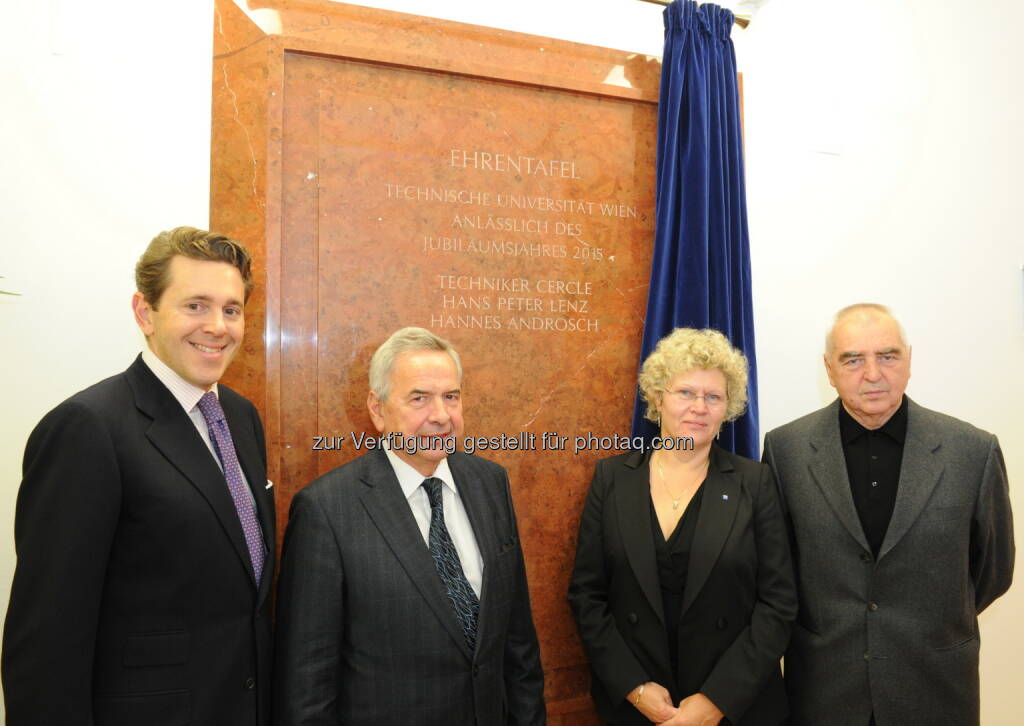 Harald Mahrer (Staatssekretär), Manfred Nehrer (Architekt, Techniker Cercle-Präsident), Sabine Seidler (TUW-Rektorin), Walter Kölbl (Künstler) : Philanthropie in Marmor gemeißelt : TU Wien enthüllt die erste Ehrentafel für große Geber und Förderer : Fotocredit: TU Wien/Blazina, © Aussendung (02.12.2015)