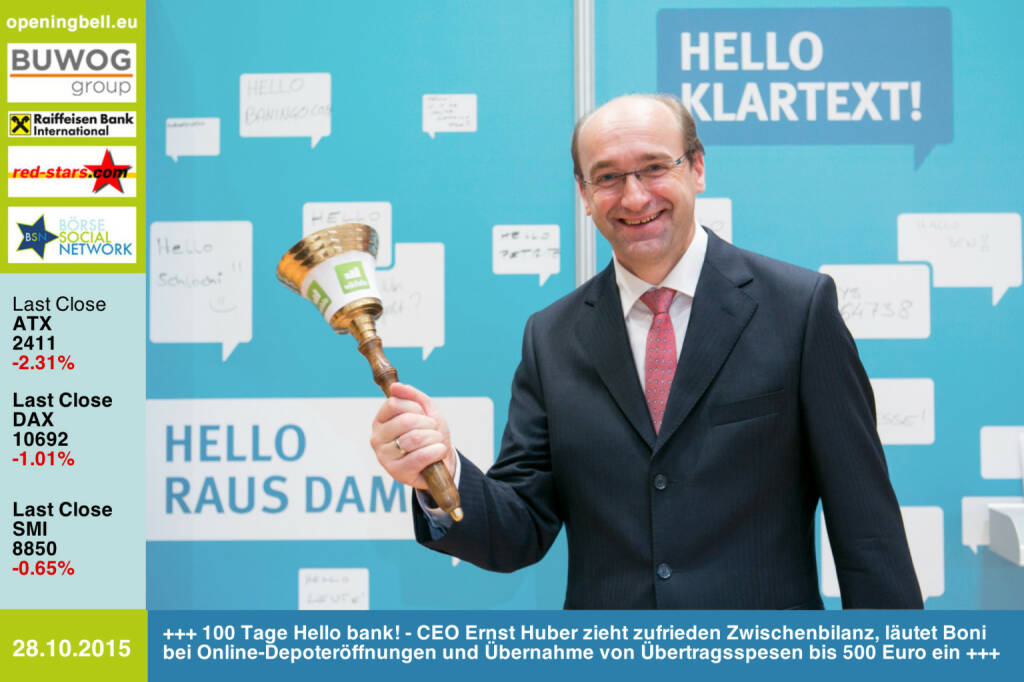 #openingbell am 28.10: 100 Tage Hello bank! - CEO Ernst Huber zieht zufrieden Zwischenbilanz, läutet Boni bei Online-Depoteröffnungen und Übernahme von Übertragsspesen bis 500 Euro ein http://www.openingbell.eu (28.10.2015)