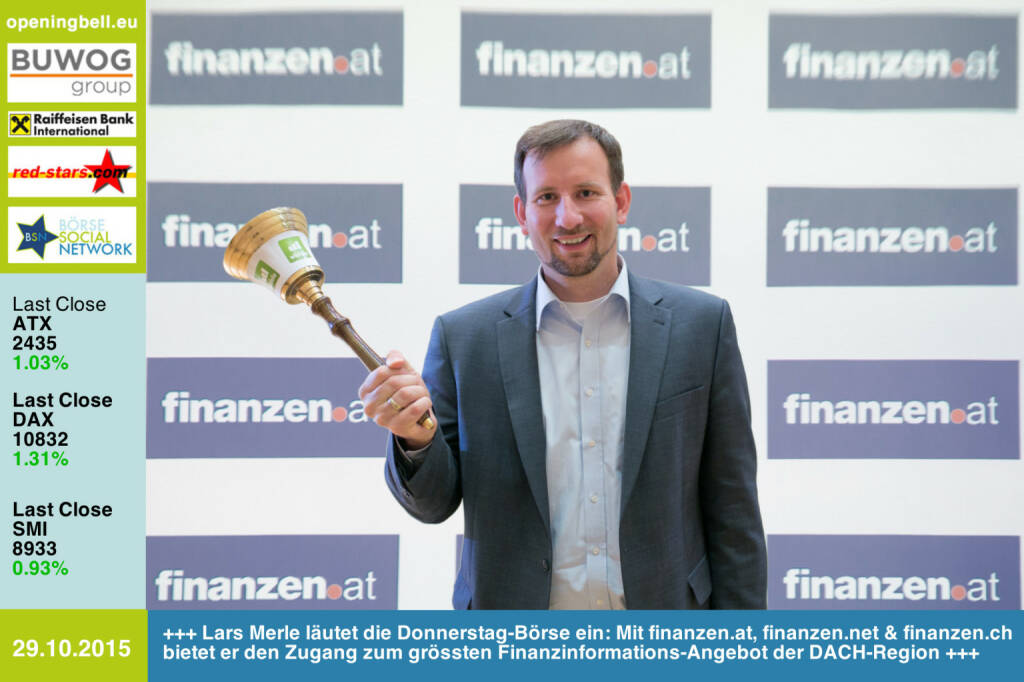 #openingbell am 29.10: Lars Merle läutet die Donnerstag-Börse ein: Mit finanzen.at, finanzen.net & finanzen.ch bietet er den Zugang zum grössten Finanzinformations-Angebot der DACH-Region http://www.openingbell.eu (29.10.2015)