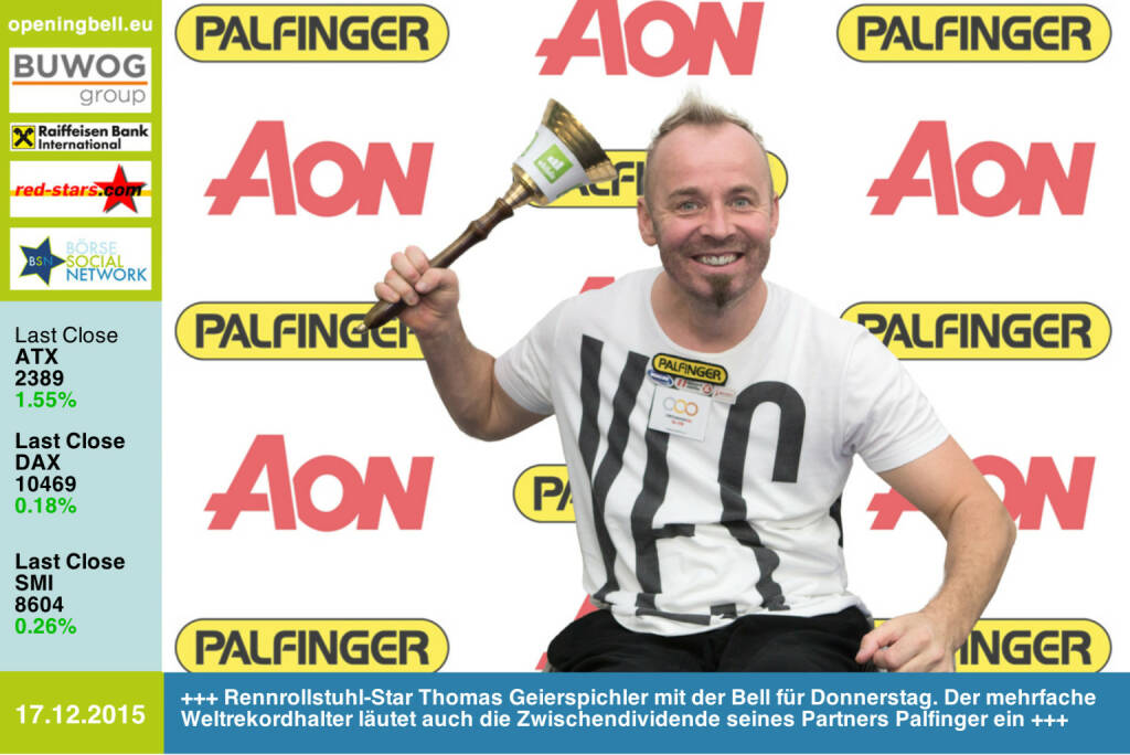 #openingbell am 17.12: Rennrollstuhl-Star Thomas Geierspichler mit der Opening Bell für Donnerstag. Der mehrfache Weltrekordhalter läutet auch die Zwischendividende seines Partners Palfinger ein http://www.palfinger.com http://www.aon.com/austria/ http://www.geierspichler.com http://www.openingbell.eu (17.12.2015)