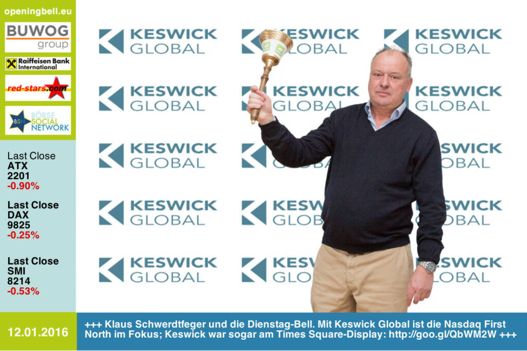 #openingbell am 12.1.: Klaus Schwerdtfeger und die Dienstag-Bell. Mit Keswick Global ist die Nasdaq First North im Fokus; Keswick war sogar am Times Square-Display: http://goo.gl/QbWM2W http://www.keswickglobal.com http://www.openingbell.eu