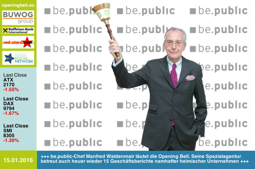 #openingbell am 15.1.: be.public-Chef Manfred Waldenmair läutet die Opening Bell am Freitag. Seine Spezialagentur betreut auch heuer wieder 15 Geschäftsberichte namhafter heimischer Unternehmen http://www.bepublic.at http://www.openingbell.eu