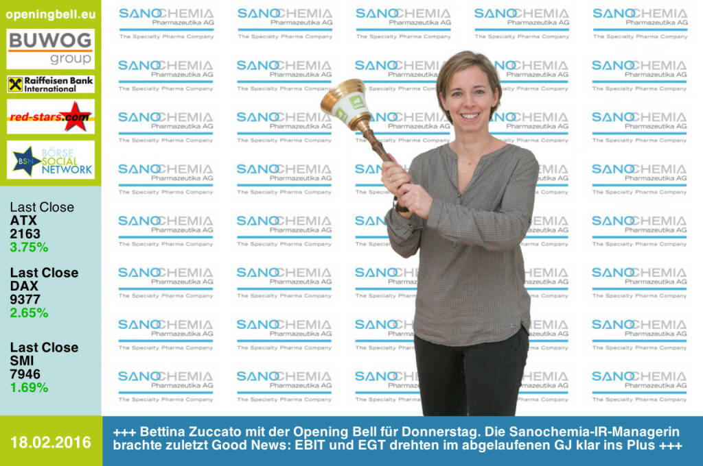 #openingbell am 18.2: Bettina Zuccato mit der Opening Bell für Donnerstag. Die Sanochemia-IR-Managerin brachte zuletzt Good News: EBIT und EGT drehten im abgelaufenen GJ klar ins Plus http://www.sanochemia.at http://www.openingbell.eu (18.02.2016)