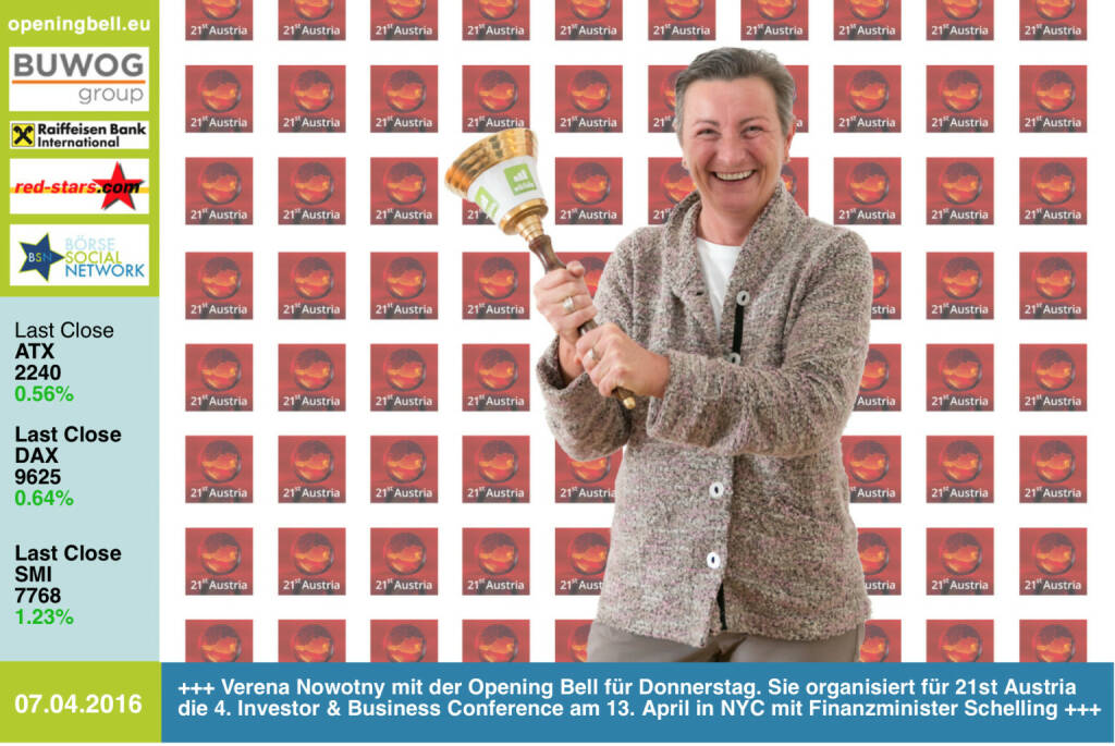 #openingbell am 7.4.: Verena Nowotny mit der Opening Bell für Donnerstag. Sie organisiert für 21st Austria die 4. Investor & Business Conference am 13. April in NYC mit Finanzminister Schelling http://austria.nyintl.net http://www.openingbell.eu (07.04.2016)