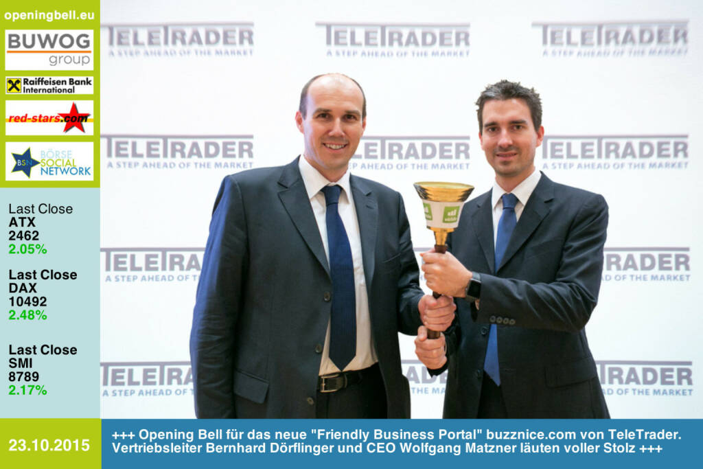 #openingbell am 23.10: Eine Opening Bell für das neue "Friendly Business Portal" http://www.buzznice.com von TeleTrader. Vertriebsleiter Bernhard Dörflinger und CEO Wolfgang Matzner läuten voller Stolz http://www.openingbell.eu (23.10.2015)