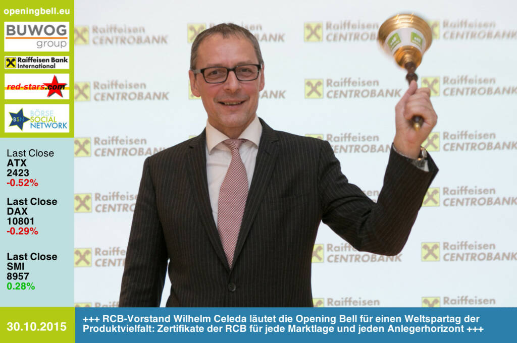 #openingbell am 30.10: RCB-Vorstand Wilhelm Celeda läutet die Opening Bell für einen Weltspartag der Produktvielfalt: Zertifikate der RCB für jede Marktlage und jeden Anlegerhorizont http://www.rcb.at http://www.openingbell.eu (30.10.2015)
