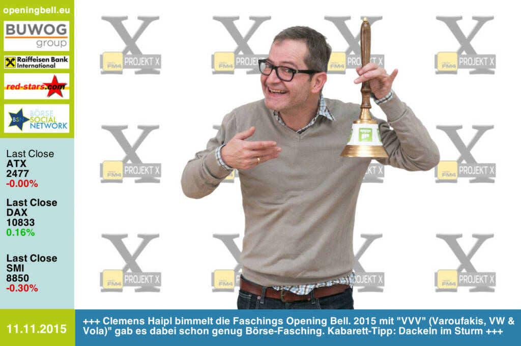 #openingbell am 11.11.: Clemens Haipl bimmelt die Faschings Opening Bell. 2015 mit "VVV" (Varoufakis, VW & Vola)" gab es dabei schon genug Börse-Fasching. Kabarett-Tipp: Dackeln im Sturm http://www.clemenshaipl.at http://www.openingbell.eu (11.11.2015)