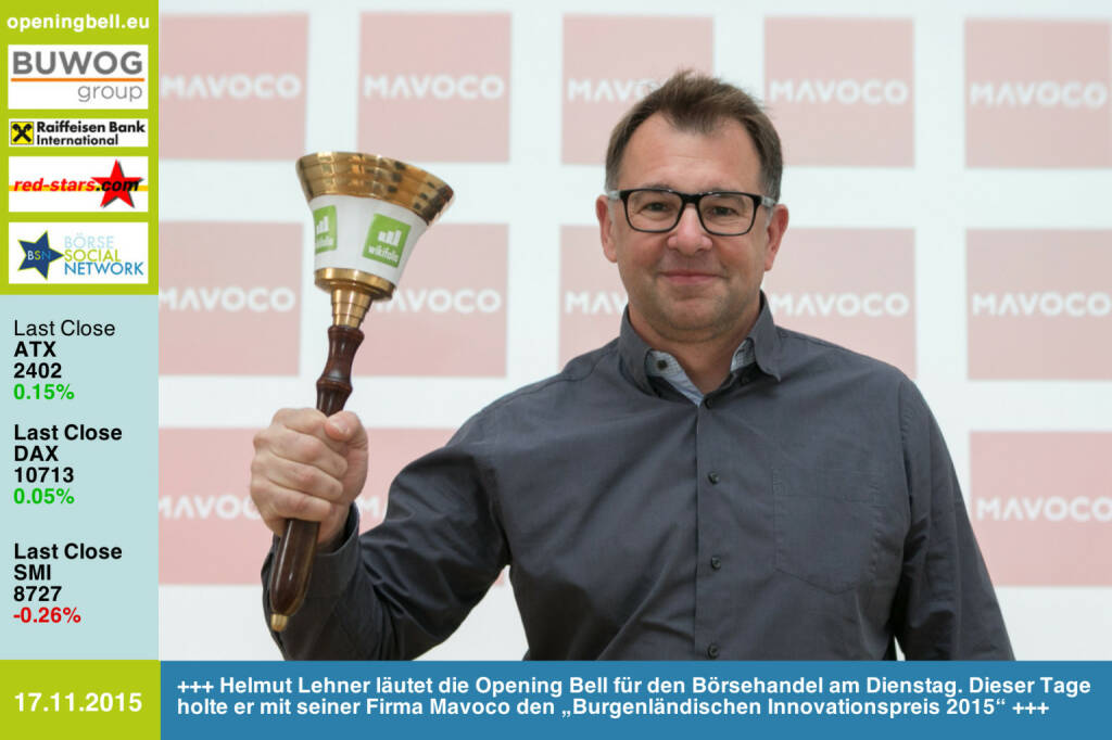 #openingbell am 17.11.: Helmut Lehner läutet die Opening Bell für den Börsehandel am Dienstag. Dieser Tage holte er mit seiner Firma Mavoco den „Burgenländischen Innovationspreis 2015“ http://www.openingbell.eu http://www.mavoco.com http://www.freeeway.com (17.11.2015)
