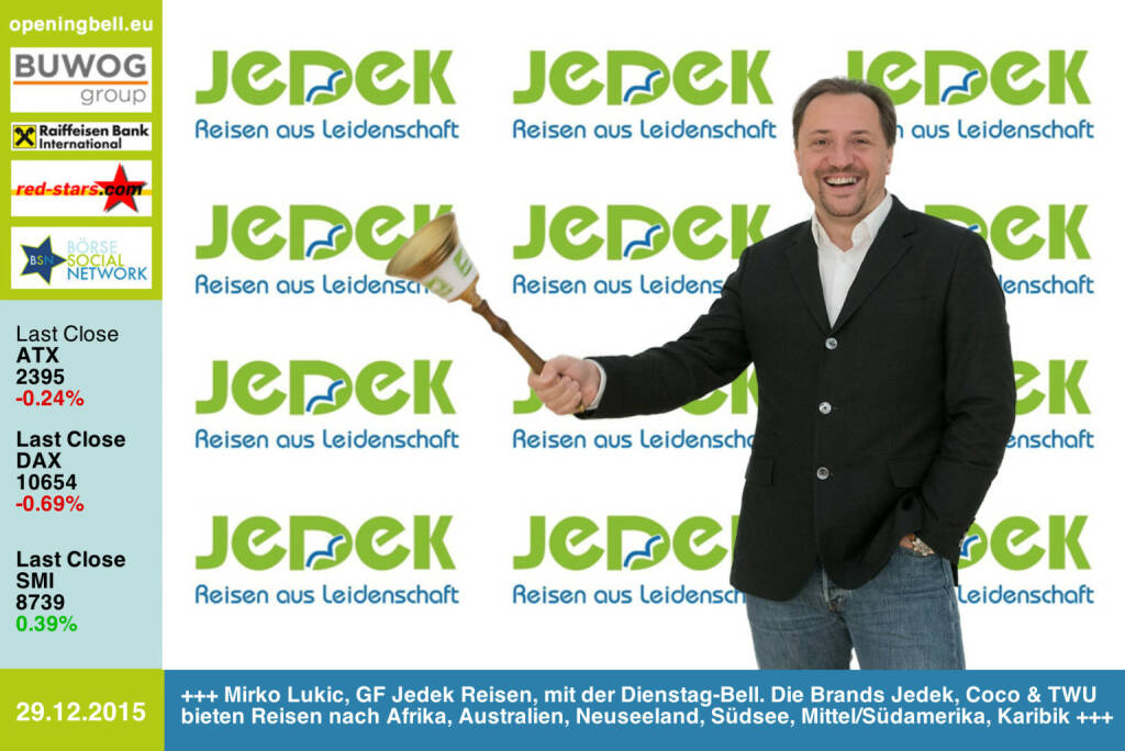 #openingbell am 29.12.: Mirko Lukic, GF Jedek Reisen, mit der Opening Bell für Dienstag. Die Brands Jedek, Coco & TWU bieten Reisen nach Afrika, Australien, Neuseeland, Südsee, Mittel/Südamerika und in die Karibik (29.12.2015)
