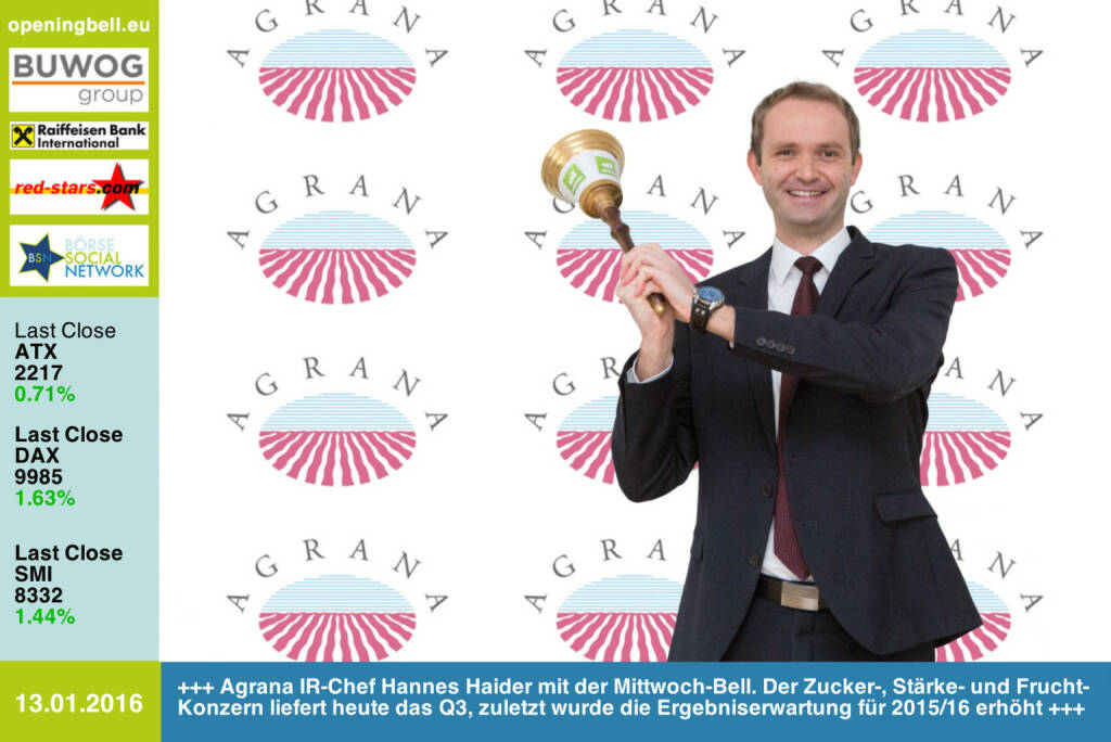 #openingbell am 13.1.: IR Manager Hannes Haider läutet am Tag der Veröffentlichung der Agrana Q3-Zahlen die Opening Bell. Der Zucker-, Stärke -und Frucht-Konzern bestätigt die Gesamtjahresprognose 2015/16 mit einem EBIT leicht über Vorjahr http://www.agrana.com http://www.openingbell.eu (13.01.2016)