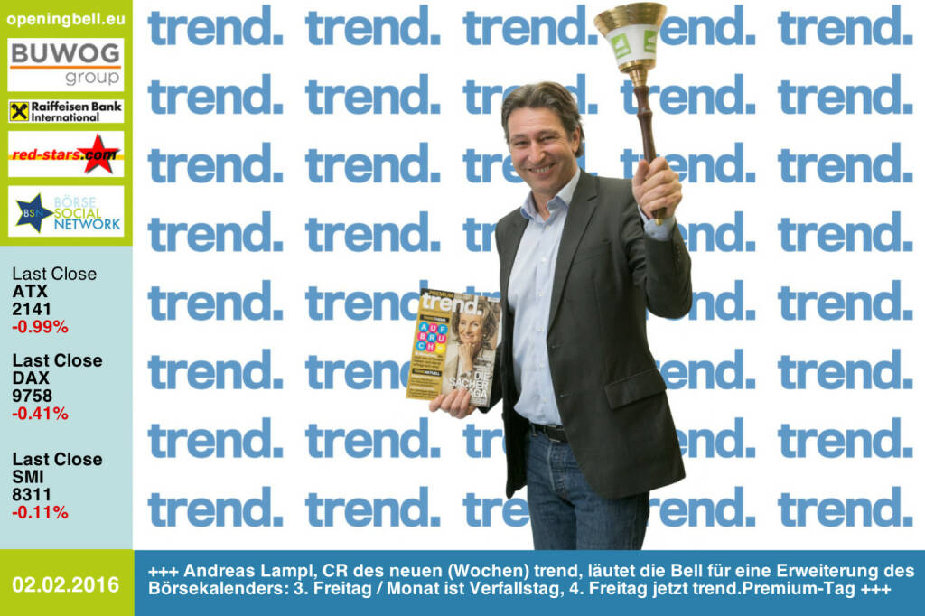 #openingbell am 2.2: Andreas Lampl, Chefredakteur des neuen wöchentlichen trend, läutet die Opening Bell für eine Erweiterung des Börsekalenders: Am 3. Freitag im Monat ist Verfallstag, am 4. Freitag jetzt trend.Premium-Tag http://www.trend.at http://www.openingbell.eu (02.02.2016)