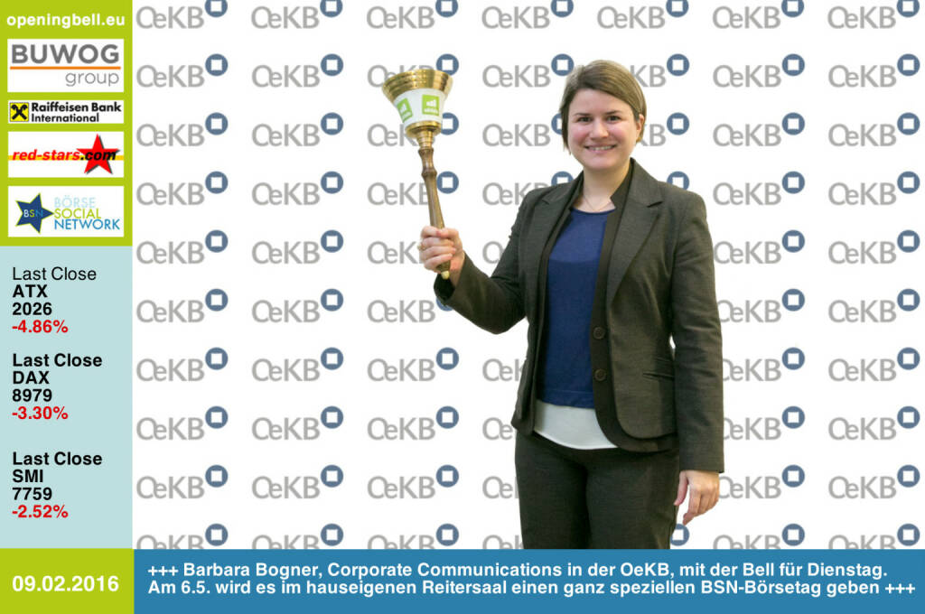 #openingbell am 9.2: Barbara Bogner, Corporate Communications in der OeKB, mit der Bell für Dienstag. Am 6.5. wird es im hauseigenen Reitersaal einen ganz speziellen BSN-Börsetag geben http://www.oekb.at http://www.openingbell.eu (09.02.2016)