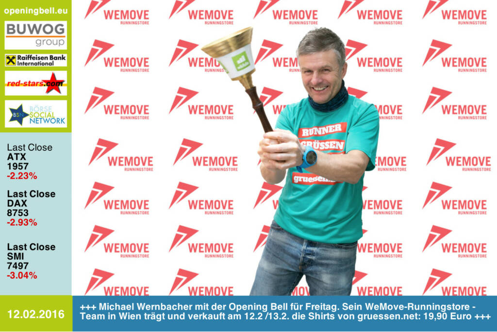 #openingbell am 12.2: Michael Wernbacher mit der Opening Bell für Freitag. Sein WeMove-Runningstore-Team in Wien trägt und verkauft am 12.2 /13.2. die Shirts von http://www.gruessen.net zu 19,90 Euro http://www.wemove.at/wemove-runningstore/ http://www.openingbell.eu (12.02.2016)