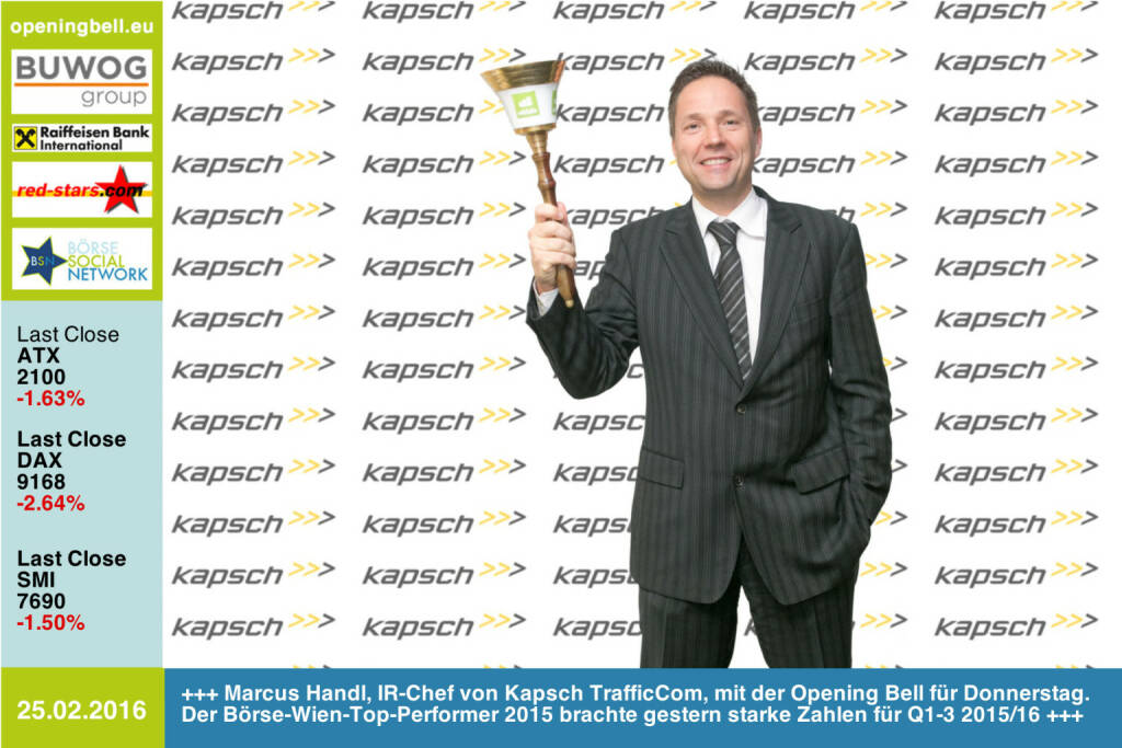 #openingbell am 25.2: Marcus Handl, IR-Chef von Kapsch TrafficCom, mit der Opening Bell für Donnerstag. Der Börse-Wien-Top-Performer 2015 brachte gestern starke Zahlen für Q1-3 2015/16 http://www.kapsch.net/ktc http://www.openingbell.eu (25.02.2016)