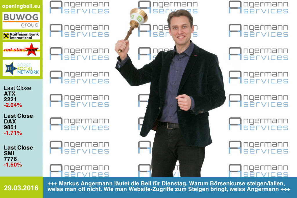 #openingbell am 29.3.: Markus Angermann läutet die Opening Bell für Dienstag. Warum Börsenkurse steigen/fallen, weiss man oft nicht. Wie man Website-Zugriffe zum Steigen bringt, weiss Angermann IT-Services http://www.angermann.at http://www.openingbell.eu (29.03.2016)