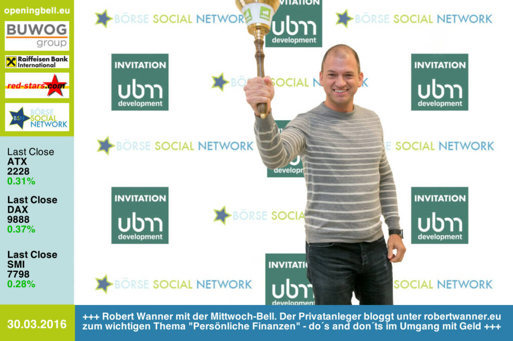 #openingbell am 30.3. in der UBM Privatanleger Invitation: Robert Wanner mit der Opening Bell für Mittwoch. Der Privatanleger bloggt unter http://www.robertwanner.eu zum wichtigen Thema "Persönliche Finanzen" - do´s and don´ts im Umgang mit Geld http://ubm.at http://www.openingbell.eu (30.03.2016)