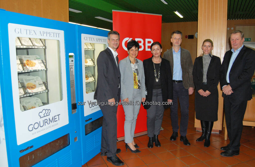 Alexander Burghardt (Gourmet-Betreuer vor Ort), Claudia Horacek (Gourmet-Geschäftsfeldleiterin für Business Catering Menüservice), Petra Fröschl (Bereichsleiterin Wohlfahrtseinrichtung und Soziales in der ÖBB-Business Competence Center GmbH), Roman Hebenstreit (Vors. des ÖBB-Konzernbetriebsrats), Claudia Eder (GF der ÖBB-Business Competence Center GmbH), Gottfried Weißengruber (Konzernvertreter Beirat Wohlfahrtseinrichtungen und Soziales) : Neue Speiseautomaten von Gourmet bieten Schichtarbeitern am ÖBB-Verschiebebahnhof Kledering rund um die Uhr ein abwechslungsreiches, warmes Mittagessen : Fotocredit: Gourmet, © Aussendung (16.12.2015)