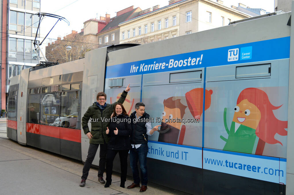 Andreas Schwaiger, Helene Czanba, Stefan Hörcsöky : TU Career Center : 10-Jahres-Jubiläum der TUday – der Jobmesse der TU Wien : „TUCC-Straßenbahn“ fährt durch Wien : Fotocredit: TU Career Center (24.03.2016)