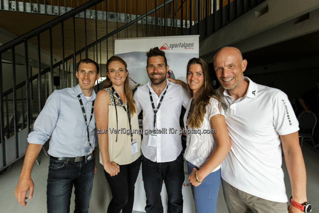Andreas Burgstaller und Cornelia Schierl (Sportalpen Marketing, Gastgeber), Hannes Arch (Speaker), Nina Geiger (Sportalpen Marketing, Gastgeber), Jakob Schmidlechner (Speaker) : Zweiter Sports & Tourism Summit in der Panzerhalle Salzburg : Fotocredit: Sportalpen Marketing (05.07.2016)