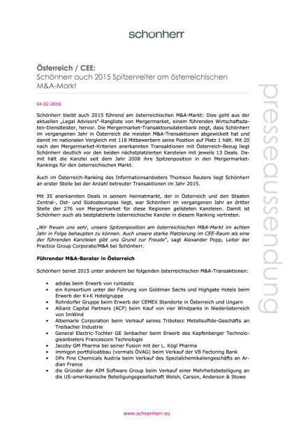 Schönherr auch 2015 Spitzenreiter am österreichischen M&A-Markt, Seite 1/2, komplettes Dokument unter http://boerse-social.com/static/uploads/file_603_schonh... (04.02.2016)