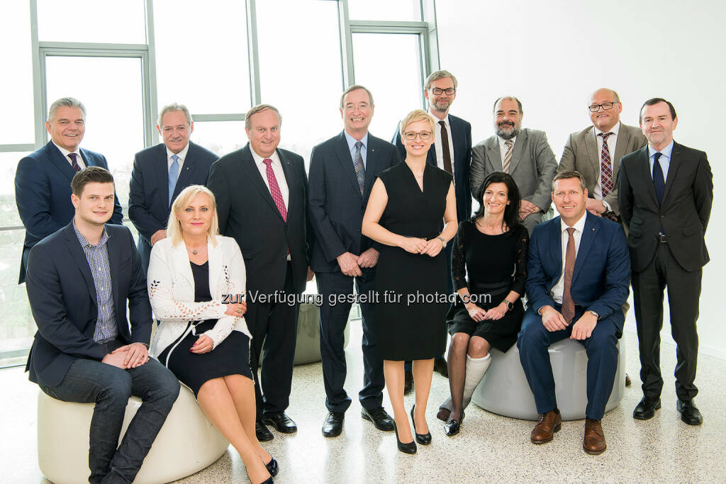 Leo Jindrak (Spartenobmann Gewerbe & Handwerk), Bernhard Aichinger (JW-Vorsitzender), Viktor Sigl (LT-Präsident), Angelika Winzig (NR), Rudolf Trauner (WKOÖ-Präsident), Christoph Leitl (Präsident), Doris Hummer (WB-Landesobfrau, LAbg.), Michael Strugl (Landesrat), Margit Angerlehner (FidW-Landesvorsitzende), Georg Spiegelfeld, Wolfgang Greil (WB-Direktor), Laurenz Pöttinger (WB-Bezirksobmann), Alfred Frauscher (LAbg.) : 23. Landestag mit WBOÖ-Neuwahl in der Linzer Bruckner-Privatuniversität : 98,4 Prozent Zustimmung für Leitl-Nachfolgerin Doris Hummer : Fotocredit: WB/Laresser, © Aussender (17.04.2016)