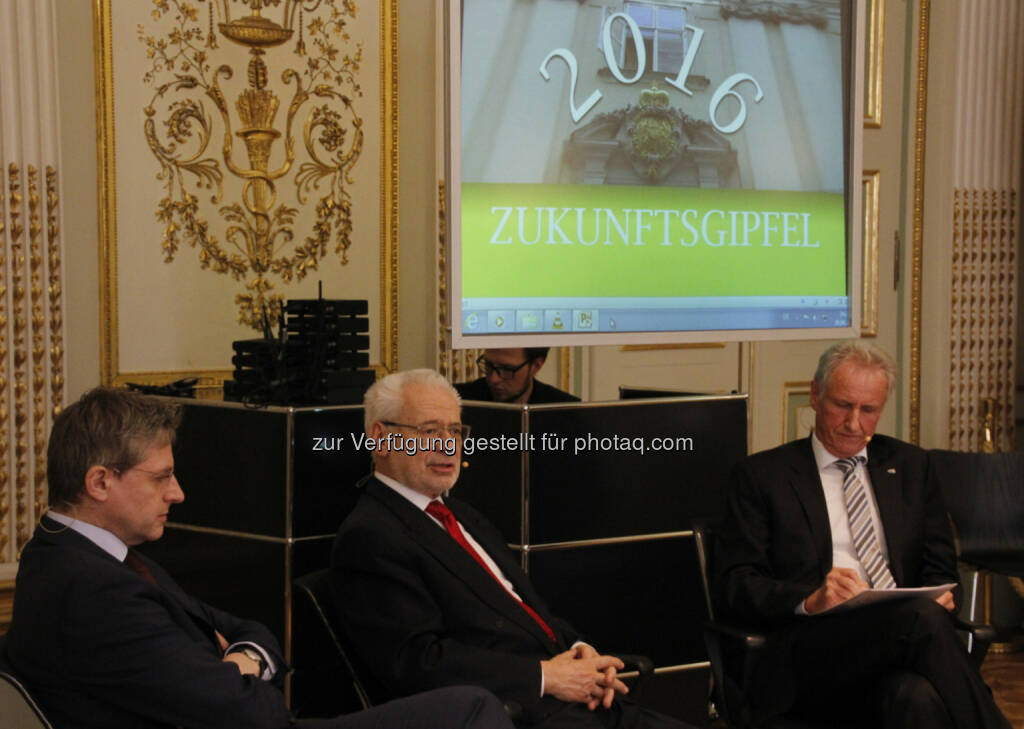Stefan Bruckbauer (Chefvolkswirt der Bank Austria), Erhard Busek (EU-Beauftragter für CEE und Präsident Senat der Wirtschaft Österreichs), Heinz Behacker (Vorstandsvors. VBV – Vorsorgekasse) : Podiumsdiskussion - Zukunftsgipfel 2016 der VBV – Vorsorgekasse : Fotocredit: VBV - Vorsorgekasse, © Aussender (29.04.2016)