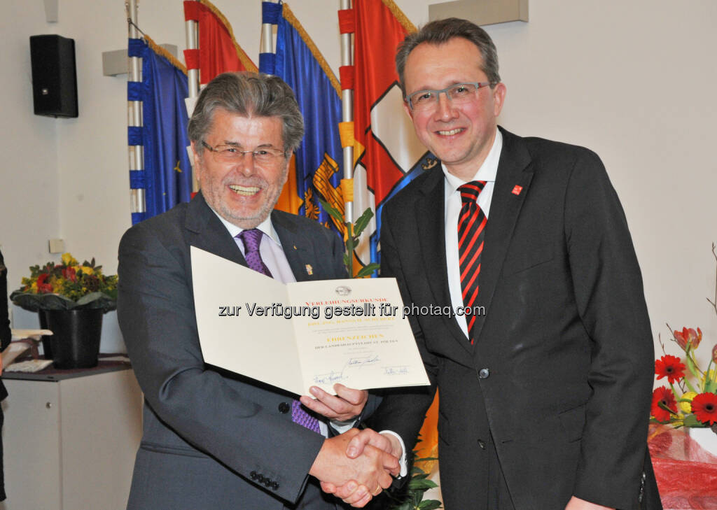 Hanns H. Schubert (Vermessung Schubert), Matthias Stadler (Bürgermeister von St. Pölten) : St. Pölten ehrt Hanns H. Schubert : Jubiläumsjahr für Vermessung Schubert : 120-Jahr-Jubiläum, 75. Geburtstag, 50. Berufsjubiläum und Ehrenzeichen der Stadt St. Pölten : Fotocredit: (c) Josef Vorlaufer, © Aussendung (07.04.2016)
