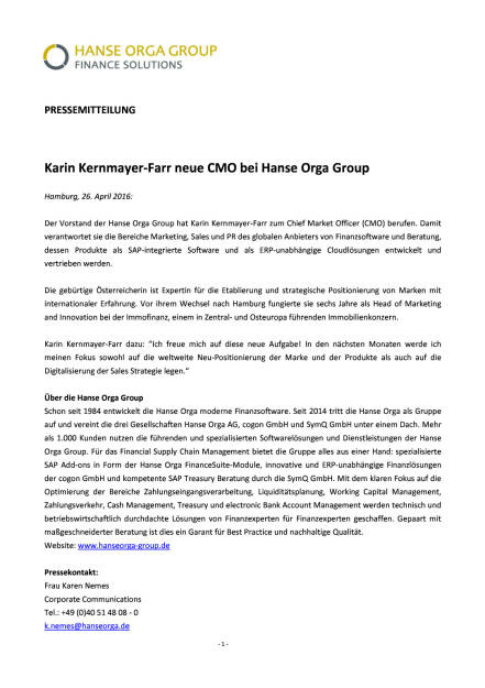 Karin Kernmayer-Farr neue CMO bei Hanse Orga Group, Seite 1/1, komplettes Dokument unter http://boerse-social.com/static/uploads/file_945_karin_... (26.04.2016)