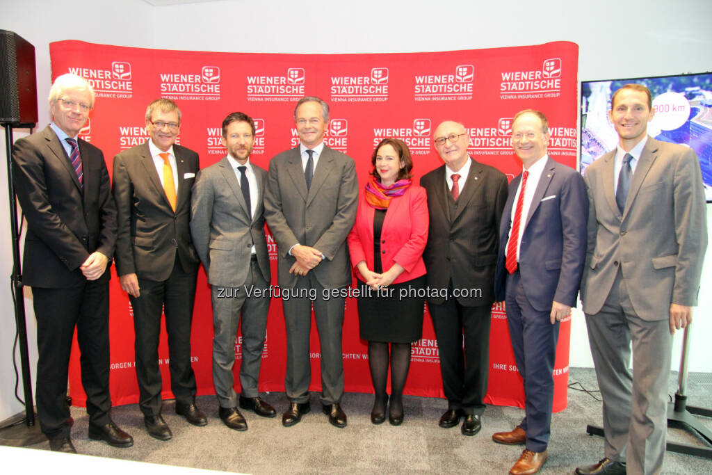 Gerhard Fabisch (Präsident Sparkassenverband), Robert Lasshofer (Generaldirektor Wiener Städtische Versicherung), Thomas Schaufler (Vorstand Erste Bank Oesterreich), Andreas Treichl (Vorstandsvorsitzender der Erste Group), Doris Wendler (Landesdirektorin Wiener Städtische Wien), Günter Geyer (Aufsichtsratschef Wiener Städtische Versicherung), Hermann Fried (Vertriebsvorstand Wiener Städtische Versicherung), Stefan Dörfler (Vorstandsvorsitzender Erste Bank Oesterreich) : Wiener Städtische Versicherung - Feierliche Eröffnung der Servicestelle am Erste Campus : Fotocredit: Wiener Städtische Versicherung/e 1, © Aussendung (17.10.2016)