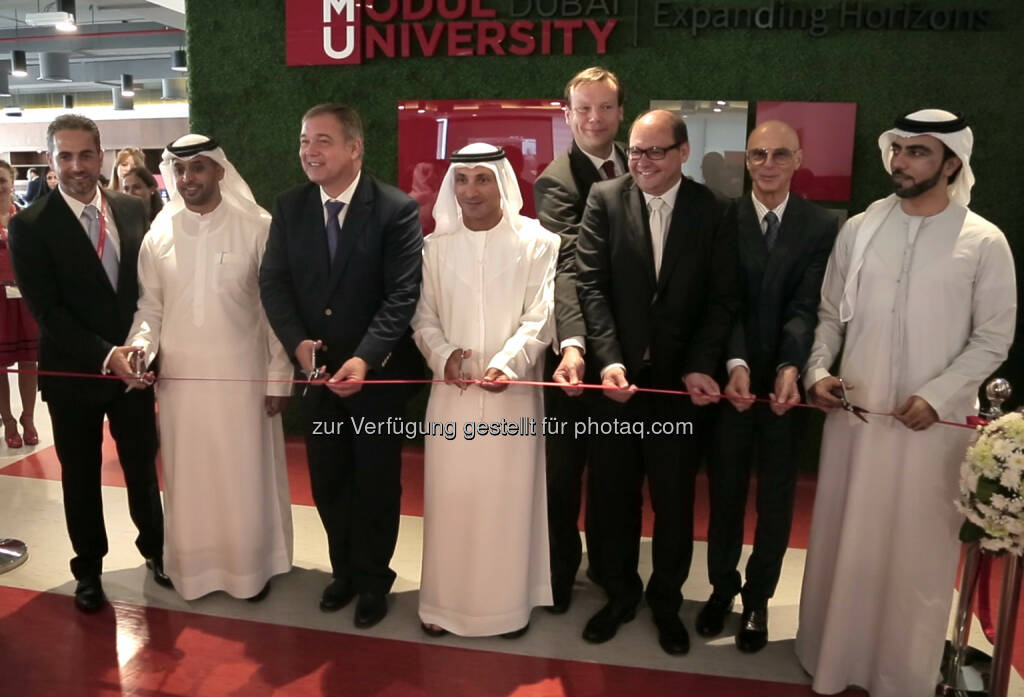 Zaid Maleh (GF von DIID Management & Modul University Dubai), Ahmad Bin Sulayem (Vorstandsvorsitzender Dubai Multi Commodities Centre Freihandelszone), Walter Ruck (Präsident Wirtschaftskammer Wien & Universitätsratsvorsitzender Modul University Vienna), Abdulla Al Karam (Vorsitzender der Knowledge and Human Development Authority/KHDA), Andreas Liebmann-Holzmann (Österr. Botschafter in Abu Dhabi), Karl Wöber (Rektor Modul University Vienna), Jörg Finsinger (Akademischer Leiter Modul University Dubai), Mohammed Saeed Al Raqbani (GF Dubai Investments) : Feierliche Campus-Eröffnung der Modul University Dubai : Fotocredit: Modul University Dubai, © Aussendung (24.10.2016)