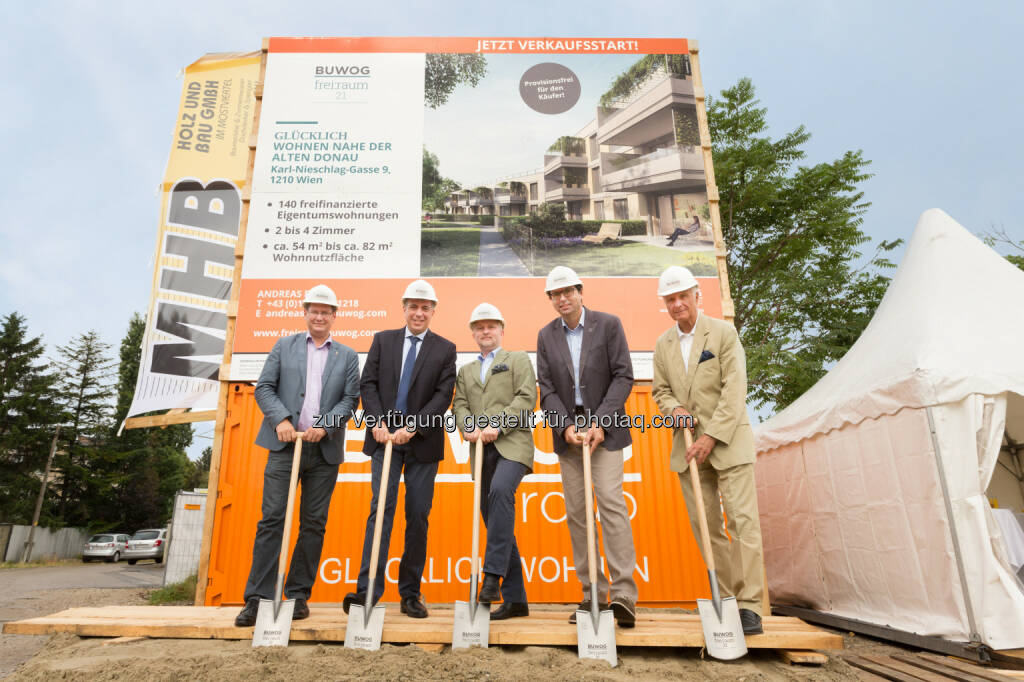 Georg Papai (Bezirksvorsteher Wien-Floridsdorf), Andreas Holler (GF Development Buwog), Peter Friedrich Berchtold (Leiter Vertrieb Buwog), Karl-Heinz Pabst (GF MHB - Holz und Bau GmbH), Ernst Huss (Architekt, Huss Hawlik Architekten ZT GmbH) : Spatenstich und Vertriebsstart Karl-Nieschlag-Gasse : Fotocredit © Buwog/Stephan Huger, © Aussendung (24.10.2016)
