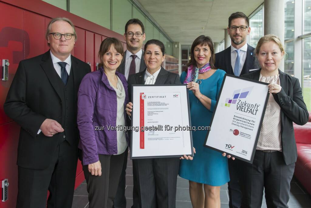 FH-Rektor Gerhard Blechinger, Martina Berthold, Peter Rieder, Eva Stockley, Doris Walter, Mathias Cimzar, Cornelia Rieß - FH Salzburg - Erste österreichische Hochschule mit Diversity-Zertifizierung (Bild: Neumayr/Leo), © Aussendung (03.11.2016)