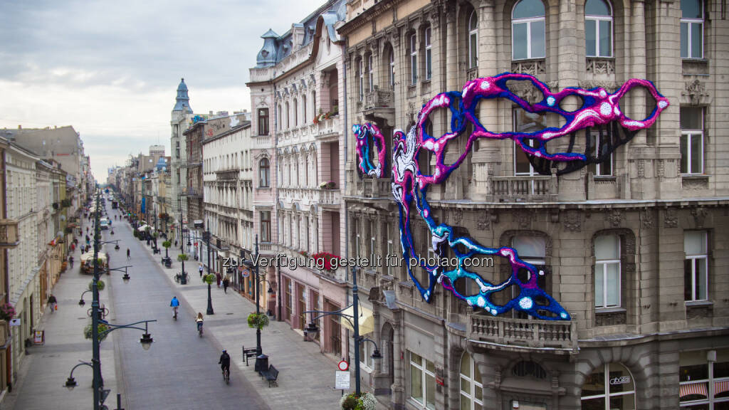 „Hyperbolic“ – So lautet der Titel der dreidimensionalen Installation, die die US-Künstlerin Crystal Wagner an der Fassade eines Jugendstilgebäudes umgesetzt hat. - Uniqa Insurance Group AG: „Uniqa Art Lodz“ verwandelt polnische Großstadt in eine öffentliche Kunstgalerie (Bild: Uniqa Polen), © Aussendung (20.12.2016)