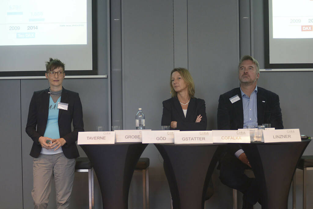 Diana Neumüller-Klein (  Strabag), Silke Krüger (Berenberg), Roman Eisenschenk (Kepler Cheuvreux), Stefan Maxian (Raiffeisen Centrobank AG, ÖVFA), Klaus Ofner (  Wienerberger AG), © C.I.R.A./APA-Fotoservice/Bargad Fotograf/in: Nadine Bargad (23.10.2016)