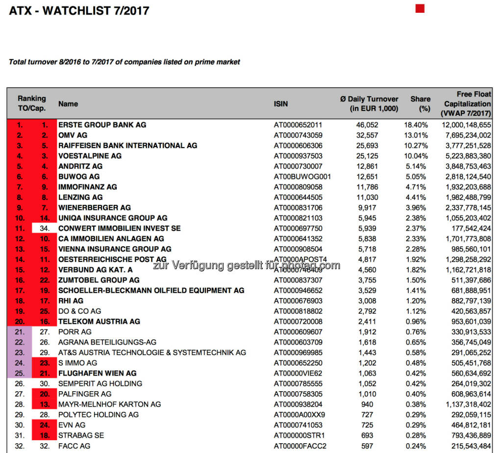 ATX-Beobachtungsliste 7/2017 (c) Wiener Börse, © Aussender (03.08.2017)