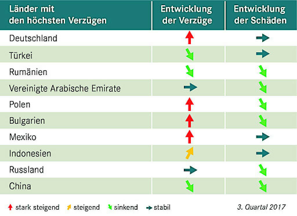 Acredia veröffentlicht für das dritte Quartal 2017 die Top 10 Exportländer mit den höchsten Zahlungsverzügen gegenüber ihren Versicherungsnehmern. Nach über einem Jahr ist Deutschland wieder auf der Liste der Top 10 Länder mit den höchsten Zahlungsverzügen zu finden. Auf Platz eins hat Deutschland die Großinsolvenz eines deutschen Küchenherstellers im dritten Quartal 2017 katapultiert. Credit: Acredia, © Aussender (08.11.2017)