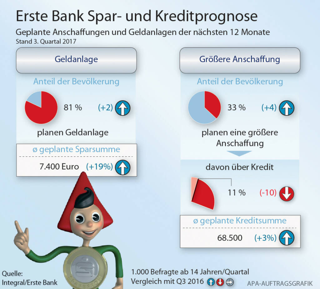 Die Österreicher wollen in den kommenden 12 Monaten wieder mehr Geld in Fonds anlegen. Das ist das Ergebnis einer Integral-Umfrage im Auftrag von Erste Bank und Sparkassen. Grafik: APA/Integral/Erste Bank, © Aussender (04.12.2017)