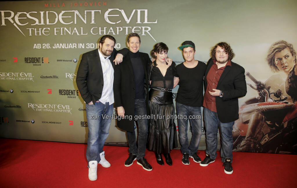 Star Gronkh, US Schauspielerin Milla Jovovich, ihr Ehemann, Regisseur und Produzent Paul W. S. Anderson sowie die YouTube Stars Robert Hofmann und LeFloid bei der Social Movie Night zu 'Resident Evil: The Final Chapter' im CineStar am 19.1.2017 in Berlin (Photo by Isa Foltin/Getty Images for Constantin Film ), © Aussendung (21.01.2017)