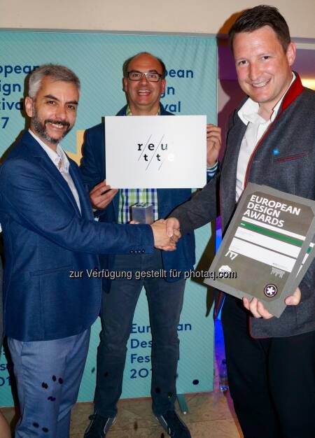 Demetrios Fakinos, Managing Director des EDA-Festivals, Christian Pölzl, Marketingleiter der Naturparkregion Reutte, Ronald Petrini, Geschäftsführer der Naturparkregion Reutte - HMC – die Boutiqueagentur für Tourismus & Freizeit: Europäische Auszeichnung für die Naturparkregion Reutte (Fotograf: Katharina Jöbstl / Fotocredit: HMC), © Aussendung (29.05.2017)