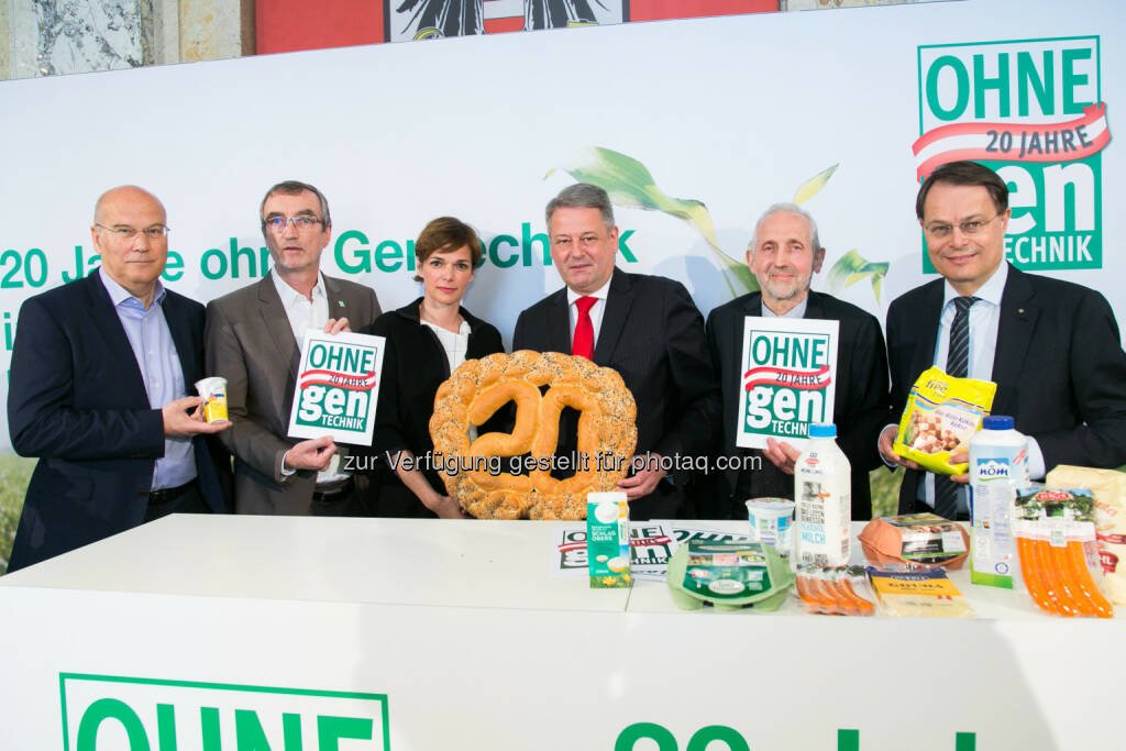 Frank Hensel (Vorstandsvorsitzender REWE International AG), Florian Faber (Geschäftsführer ARGE Gentechnik-frei), Pamela Rendi-Wagner (Gesundheitsministerin), Andrä Rupprechter (Landwirtschafts- und Umweltminister), Markus Schörpf (Obmann ARGE Gentechnik-frei), Gerhard Drexel (Vorstandsvorsitzender SPAR Österreich) - ARGE Gentechnik-frei: 20 Jahre Ohne Gentechnik – Österreich europaweiter Vorreiter bei Lebensmittel ohne Gentechnik (Fotocredit: ARGE Gentechnik-frei/APA-Fotoservice/Rastegar), © Aussender (02.05.2017)