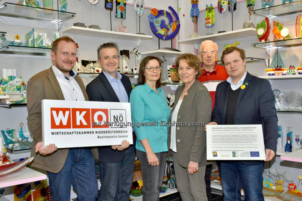 JW-Landesvorsitzender Jochen Flicker, Bezirksstellenleiter Andreas Krenn, Elisabeth Burger, WKNÖ-Präsidentin KR Sonja Zwazl, Josef Boigner und Geschäftsführer Andreas Schwarzinger von der Destination Waldviertel - Projektmanagement Handwerk & Manufaktur im Waldviertel: Waldviertel: Goldener Boden für "Handwerk und Manufaktur" (Fotocredit: WKNÖ / Matthias Ledwinka), © Aussender (16.05.2017)