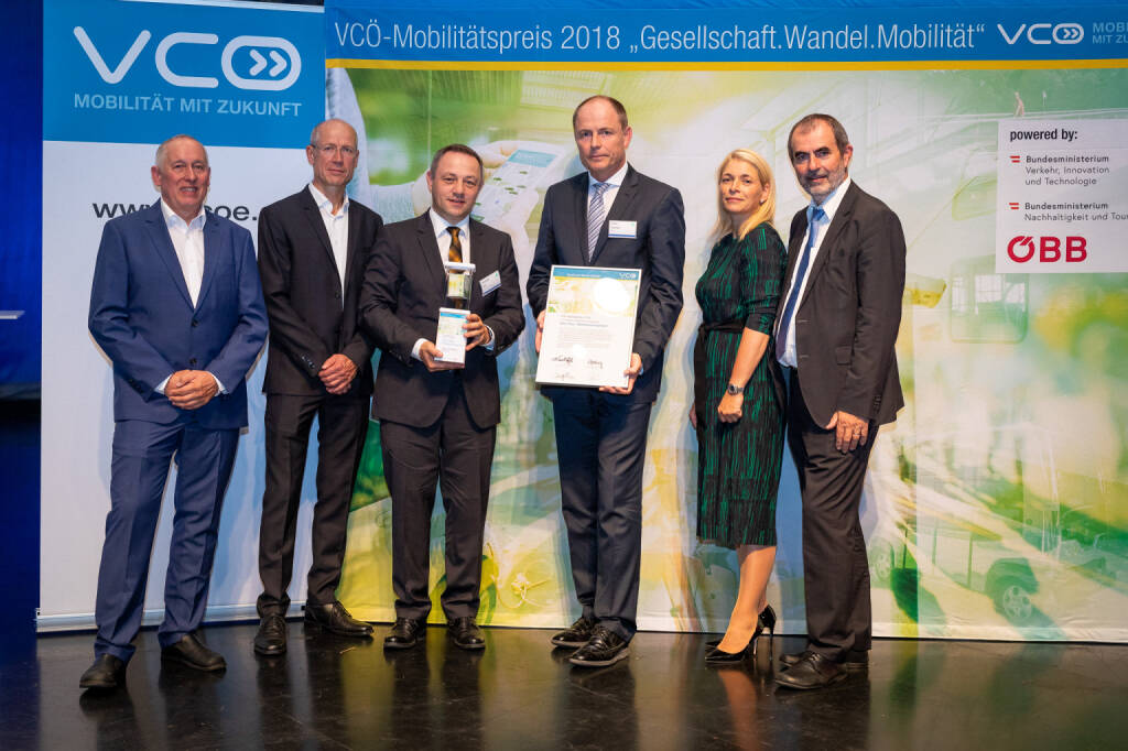 Infineon Austria gewinnt den VCÖ Mobilitätspreis 2018 in der Kategorie „Arbeitswelt und Ausbildung“. Der Preis wurde am 18. September 2018 vom Verkehrsclub Österreich in Wien verliehen. VCÖ Mobilitätspreis-Gala in Wien, v.l.n.r.: VCÖ-Geschäftsführer Willi Nowak, bmvit-Sektionschef Herbert Kasser, Alexander Tarzi (Leiter Unternehmenskommunikation Infineon Austria), Oliver Heinrich (Finanzvorstand Infineon Austria), Evelyn Palla (Vorstand ÖBB-Personenverkehr AG) und BMNT-Generalsekretär Josef Plank. Credit: Matthaeus Schmid, The Funky Eye, © Aussendung (19.09.2018)