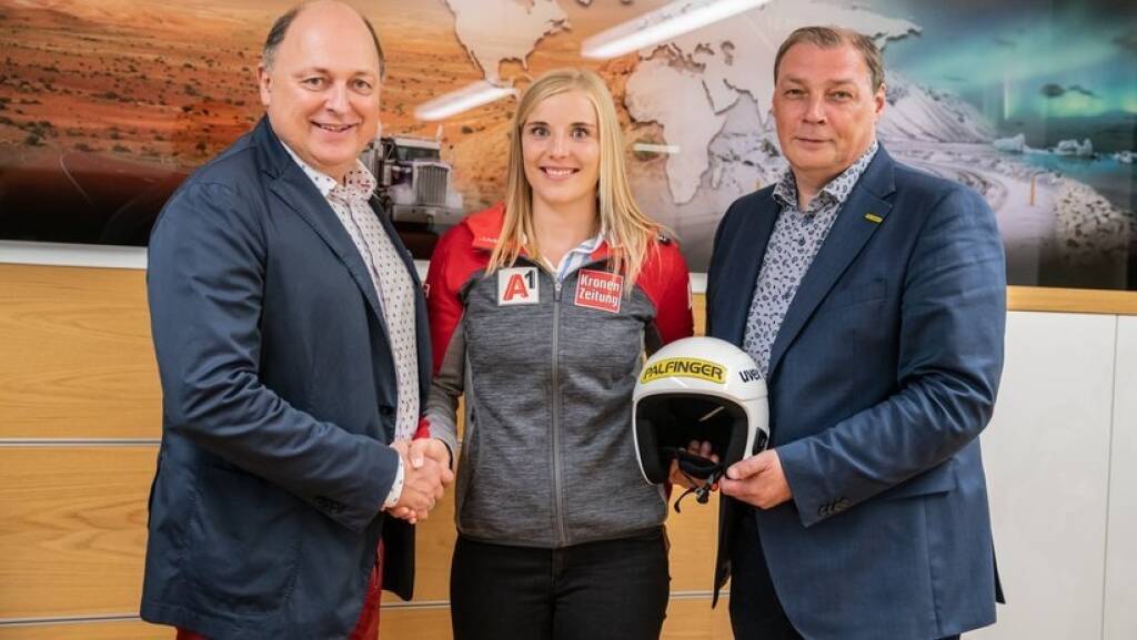 Die Palfinger Gruppe wird in den nächsten zwei Jahren die Skirennläuferin Elisabeth Reisinger sponsern. Ab der kommenden Saison ziert das Logo von Palfinger den Helm der 23-jährigen (im Bild mit CEO Klauser und IR-Manager Hannes Roither; Credit: Palfinger, © Aussendung (08.08.2019)