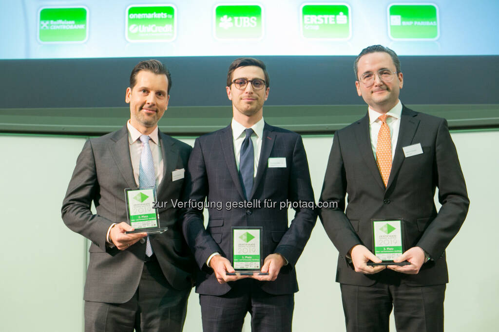 Zertifikate Award Austria 2019 - Gesamtwertung, Frank Weingarts (UniCredit onemarkets), Philipp Arnold (RCB), Uwe Kolar (Erste), © Martina Draper (10.05.2019)