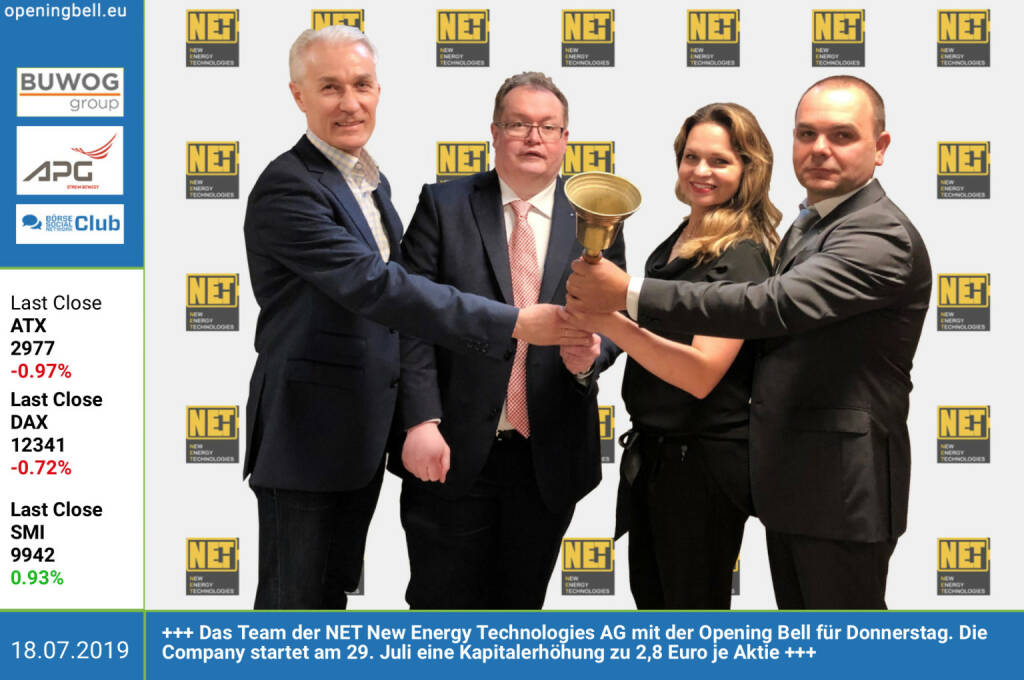 18.7.: Das Team der NET New Energy Technologies AG mit der Opening Bell für Donnerstag. Die Company startet am 29. Juli eine Kapitalerhöhung zu 2,8 Euro je Aktie. www.newenergytechnologies.at https://www.facebook.com/groups/GeldanlageNetwork (18.07.2019)