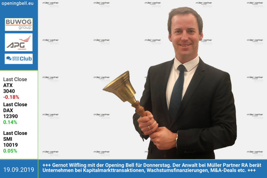 19.9.: Gernot Wilfling mit der Opening Bell am Donnerstag. Der Anwalt bei Müller Partner RA berät Unternehmen bei Kapitalmarkttransaktionen, Wachstumsfinanzierungen, M&A-Deals etc. https://www.mplaw.at http://www.boerse-social.com (19.09.2019)